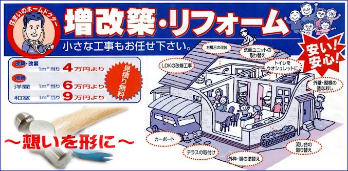 〜お客様の思いを形に〜 ★増改築・リフォームの事ならおまかせ下さい。★ 水廻り工事・内装工事・外装工事・シロアリ工事・塗装工事・電気工事・エクステリア工事・耐震補強工事・他 お客様の立場に立ってご提案致します。